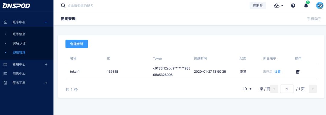 这里我的域名解析用的腾讯云,也就是 DNSPod,怎么实现自动化 DNS 验证呢?当然是 API 了,在 https://console.dnspod.cn/account/token 申请一个 API Token 就行了: