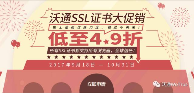 沃通SSL证书帮助网站建立安全的数据交互、树立可信的品牌形象,并提供最优惠的SSL证书价格。近期沃通推出沃通SSL证书大促销国庆特惠活动,SSLPro证书低至4.9折,SSLPre证书买两年送一年,多年期、多域名及通配域名同享优惠!以最高级别的超安SSLPro(EVSSL)为例,折后仅需4355元/年,相当于每天仅需11元,网站即可在所有浏览器展示绿色地址栏和单位名称,并建立安全的HTTPS加密传输。