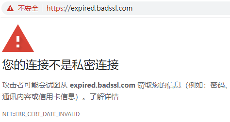 浏览器在验证了SSL证书是可信根签发并且没有被吊销后,还会查验SSL证书是否过期,因为所有SSL证书都是有效期的,目前的标准是一年。用户必须在证书过期前续期证书,否则浏览器会显示不安全,具体错误信息是:ERR_CERT_DATE_INVALID (证书已过期)。