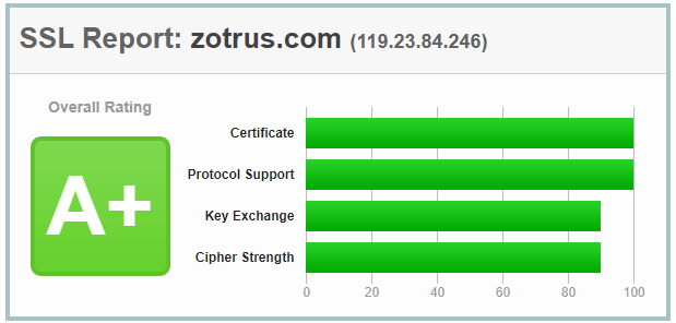 这也是零信浏览器全球独家特色服务,零信浏览器会在完成所有SSL证书验证后根据SSL证书的类型、SSL协议支持、密钥交换、密码强度等四个维度来对SSL证书的部署做一个全面的SSL安全体检打分,再加上网站是否有WAF防护,是否有可信身份认证等指标给网站打一个安全分,让用户对网站的安全情况一目了然。这个体检打分标准是参考著名的Qualys SSL Labs的SSL体验打分标准的,如下上图所示为零信浏览器对零信官网的体检打分,如下下图所示为SSL Labs为零信官网的打分,都是A+。