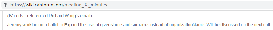 笔者联合DigiCert的JeremyRowley和StartCom的Eddy Nigg共同发起了CA/浏览器论坛的第175号提案--在SSL证书主题信息中增加姓和名字段,提案获得通过,并在随后更新的SSL证书标准中体现这次修订,这标志着拥有专用字段的IV SSL证书正式诞生,笔者现在对此仍然感到非常的自豪。