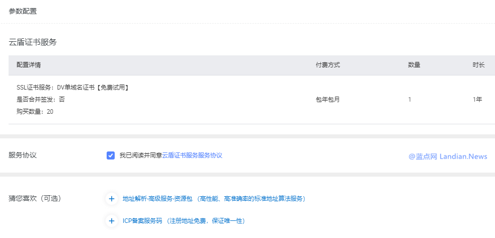 点击选购证书然后点击单域名证书免费试用,购买这个套餐可以为20个域名(含子域名)申请1年期的SSL证书。