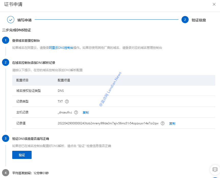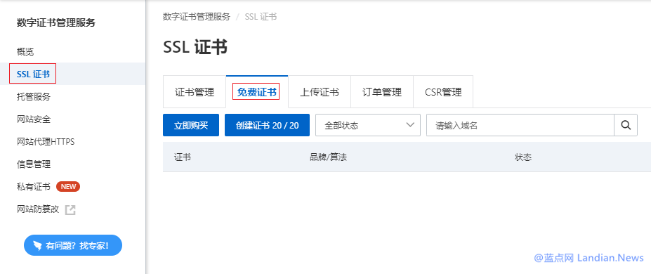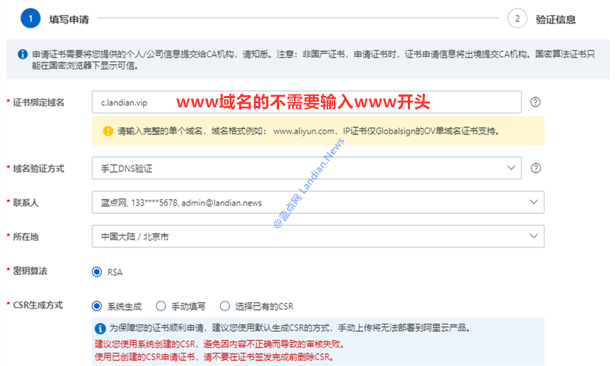 在免费证书里点击创建证书然后点击后面的证书申请,按系统提示依次输入域名、联系人、邮箱、CSR信息。其中域名若填写landian.news则同时签发www.landian.news和landian.news证书,其他子域名为单个证书。