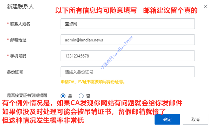 联系人可以随意填写、邮箱是否留真实邮箱自选,如果留假邮箱可能无法收到到期提醒或者其他安全提示等。联系人手机号码也可随意填写不建议留真实号码、地区也是随便选默认的中国北京即可也没必要单独去修改。