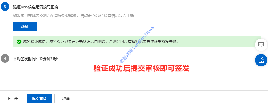 上面这个步骤也可以忽略因为诸如DNSPOD等DNS解析提供商基本都是1分钟就生效的 , 直接去点验证即可。提交审核后正常会立即签发证书,然后我们点击下载证书,选择 NGINX 版到本地将证书和私钥都解压出来。