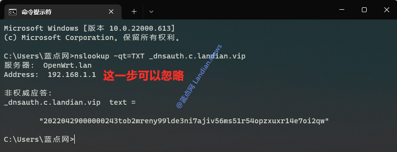 配置完成后我们先本地验证下是否生效,在CMD里使用nslookup -qt=解析类型 完整域名即可看到记录值。比如 nslookup -qt=TXT _dnsauth.c.landian.vip 可以返回我们刚刚添加的记录值说明已经生效可以点验证。