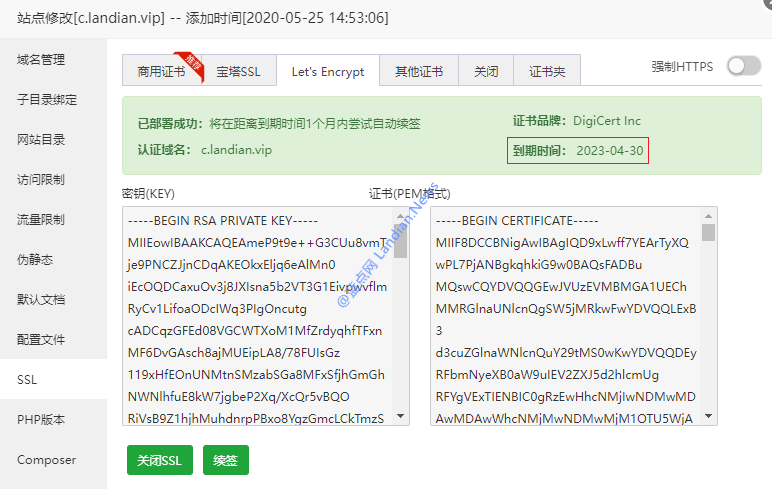 使用记事本或代码编辑器打开pem证书和key私钥按需使用 ,例如在宝塔面板里我们到SSL里粘贴证书内容。将pem文件里的内容粘贴到证书里,将key里面的内容粘贴到私钥里,点击保存立即生效此时可HTTPS访问。如果你使用国内的CDN可以到CDN控制台里上传证书,然后部署即可,1年期的证书好处就是不需要频繁换。