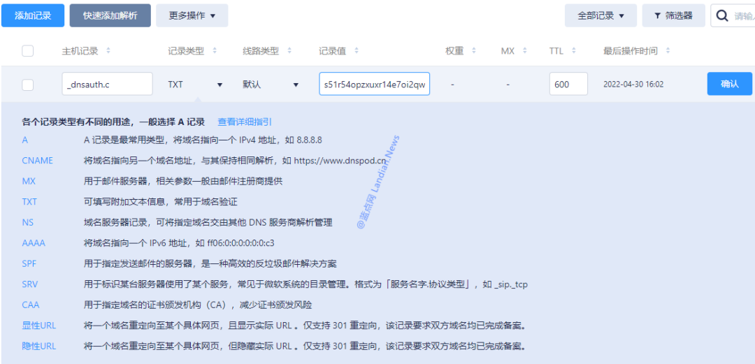 前步骤完成操作后接下来就会生成解析验证记录,我们需要转到域名解析里添加记录,具体请看下面的图片。