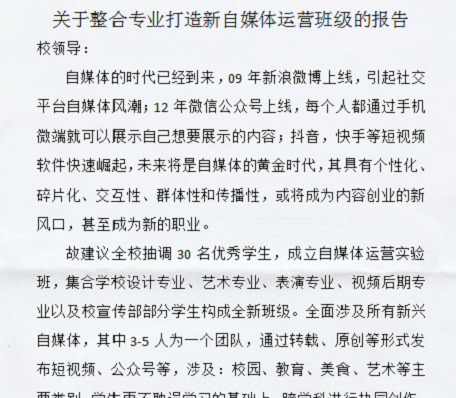 现在几乎每个学校都存在1-3个校园网红,其在抖音、快手等平台拥有一定的粉丝群体,通过野生模式进行日常运营,获得粉丝打赏,这一点相关院校领导老师或许有所耳闻,有些院校仅底线教育及红线警告,并没有进行专业引导和创作的支持,假如有校方的引导,并提供专业的技术教学和团队支撑,并对接优质的企业货源资源,实现互联网营销专业的初步运营没有任何问题。先从社团开始,并慢慢孵化,2-3年即可熟悉专业流程和专业师资的培养,对于这种轻资产的内容创业,投入成本少,且符合当前学生的喜好,甚至可以将所学专业学以致用,开展创新创业,这样或许能孵化出几个创业典型,成为未来专业招生的重要依仗。