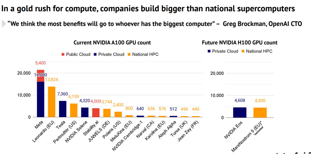 Stateof.ai去年发布了一份人工智能状况报告,对当前各企业和机构拥有的A100和H100数量进行了统计。