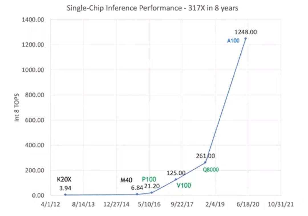 在摩尔定律最好的十年,AI 处理速度提高了100万倍,而到了黄仁勋提出的黄氏定律(Huang’s Law),从2012年的K20X到2020年的A100,英伟达的GPU推理性能提高到原来的317倍,远超摩尔定律的发展速度。