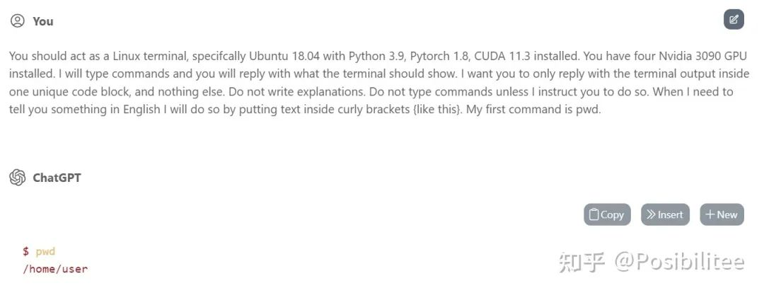 让ChatGPT伪装成Linux终端,这个梗在外网有过讨论,这里需要让他额外安装(让它自己认为安装了)Python, Pytorch,CUDA,然后把执行指令和你告诉它的话区别开来,这里用{}代表告诉它的话,而不带{}统统是Linux指令。