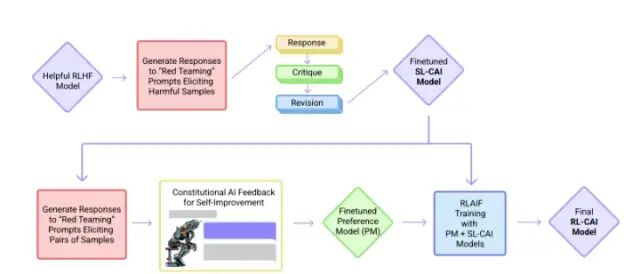 CAI用人工智能反馈来代替人类对表达无害性的偏好,即RLAIF,人工智能根据一套constitution原则来评价回复内容。