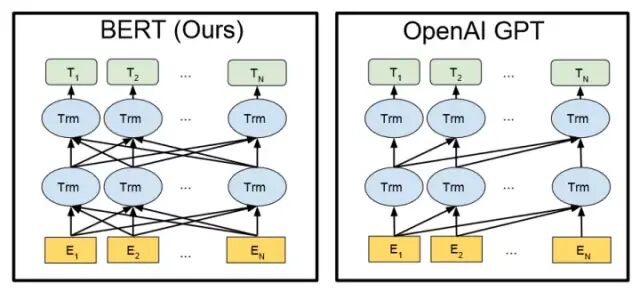 BERT与GPT的技术架构(图中En为输入的每个字,Tn为输出回答的每个字)