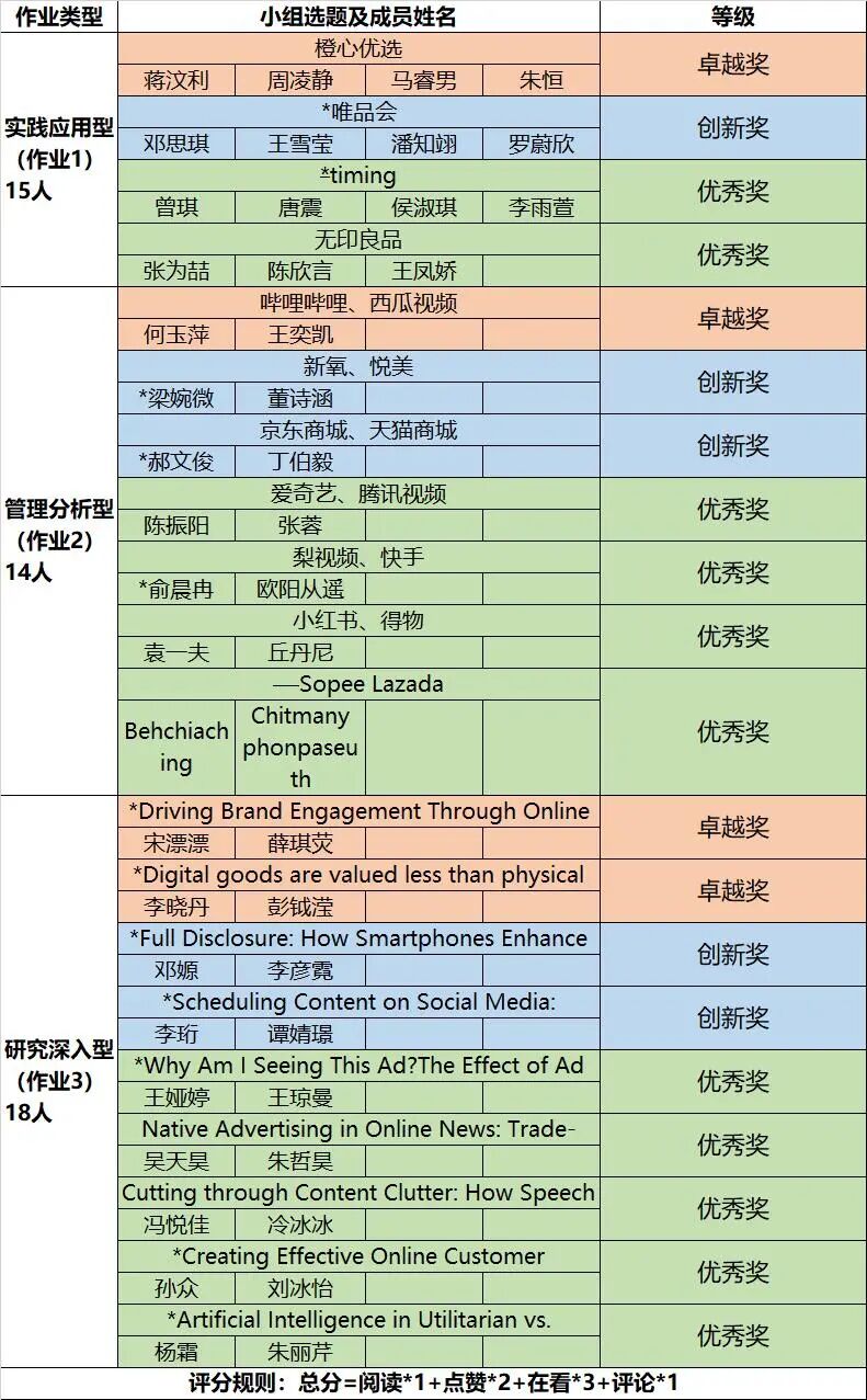 对于以期末作业为原型做成的推文,我们按浏览量、在看数和留言数进行加权计分,经过激烈的角逐,我们最终的评选结果如下: