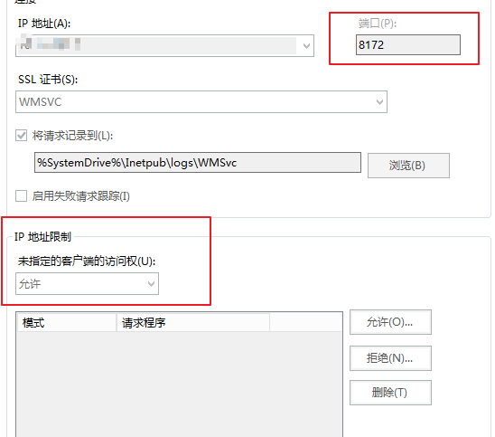 若这里的IP地址限制中,未指定的客户端的访问全为禁止,那么你需要指定你的发布客户端所在IP被允许访问
