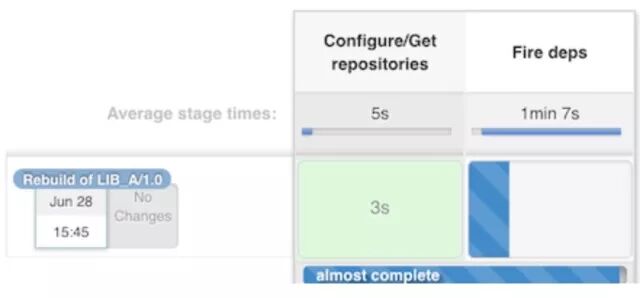 这意味着我们需要开始构建 B,然后我们可以并行构建 D 和 F,最后构建 G。请注意,库 C 不需要重建,因为它不受 A 库变化的影响。