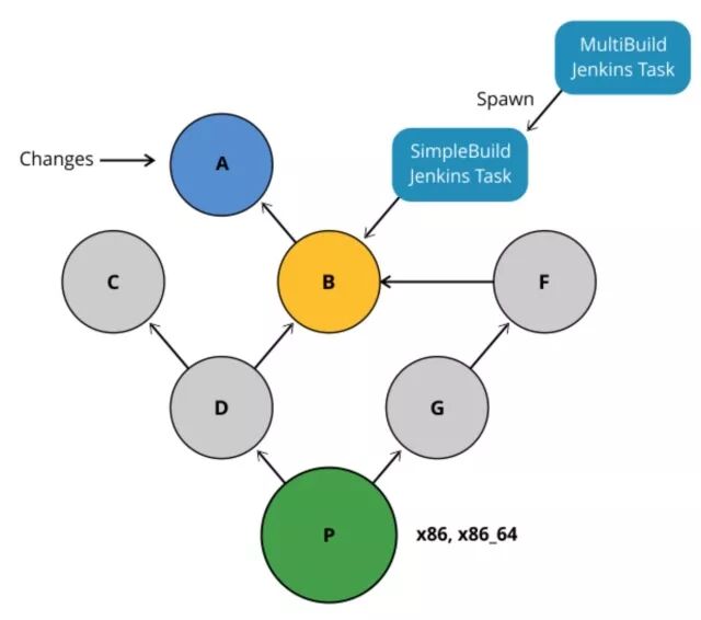 两个 SimpleBuild 任务将被触发,都是用于构建库 B,一个用于 x86 还是另一个用于 x86_64 体系结构
