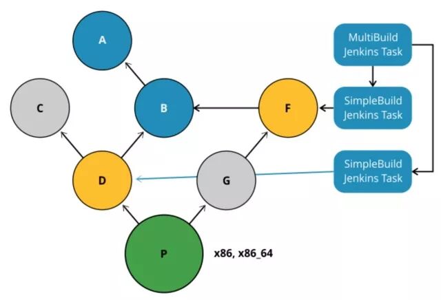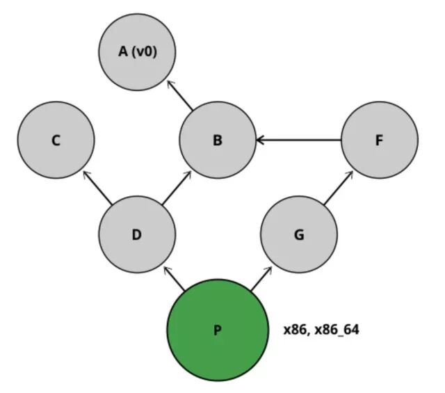 上图显示了我们的项目 P 及其依赖关系(A-G)。我们希望分发两个不同的体系结构,x86 和 x86_64。