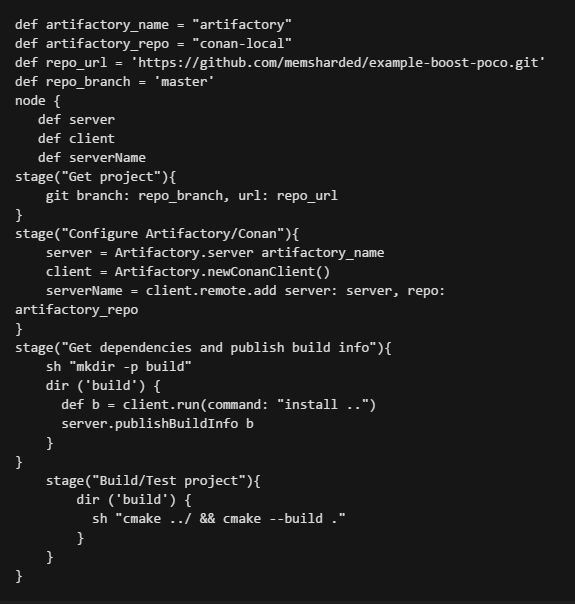 下面是带有 Artifactory 插件的 Conan DSL 的一个例子。首先我们配置 Artifactory 存储库,然后检索依赖关系并最终构建它: