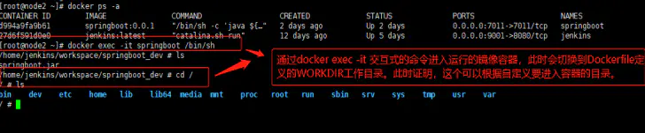 WORKDIR 工作目录说明进入容器此时会有一个.jar是在Dockerfile的ADD添加进去