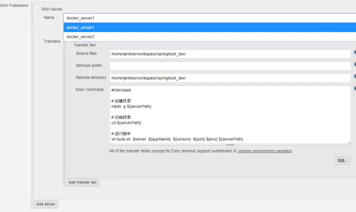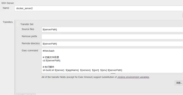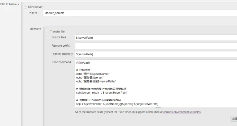 ${serverPath}获取docker_server1表示与Jenkins部署同一个宿主机,使用脚本有远程机器shell脚本操作免登陆操作。