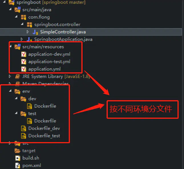 以开发环境的Dockerfile为例,如果是测试环境则,把所有路径包含springboot_dev改成springboot_test