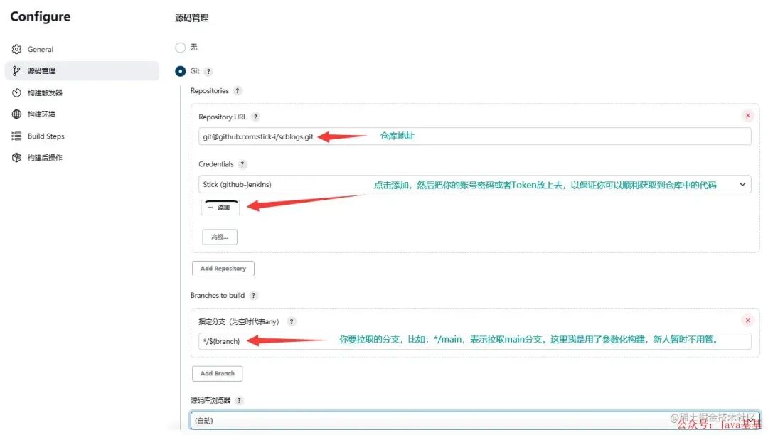 现在我们已经进入到任务配置界面了,往下划到源码管理的地方,选择 Git,然后填写仓库地址等信息: