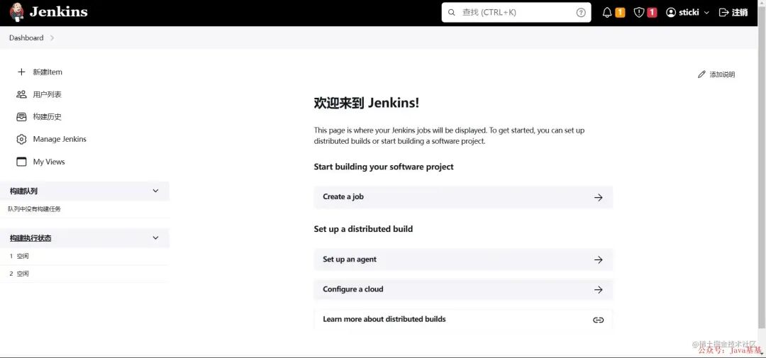 随后就进入到 Jenkins 的管理界面了,不同版本的 Jenkins 界面可能会不一样: