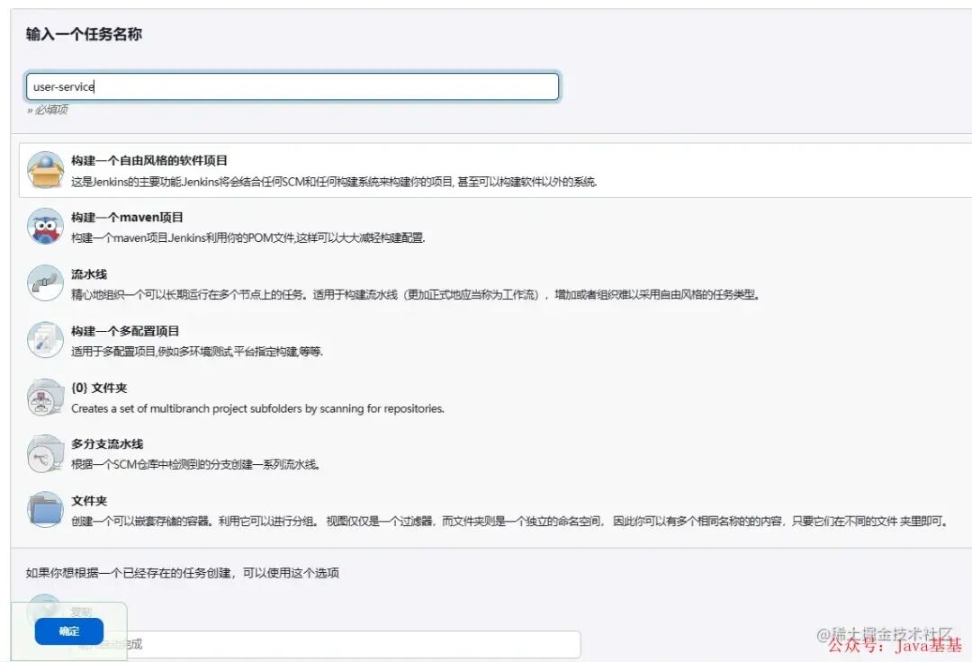 好,现在我们已经准备好环境了,可以创建一个任务来试试水了,输入任务名称,然后选择构建一个自由风格的软件项目: