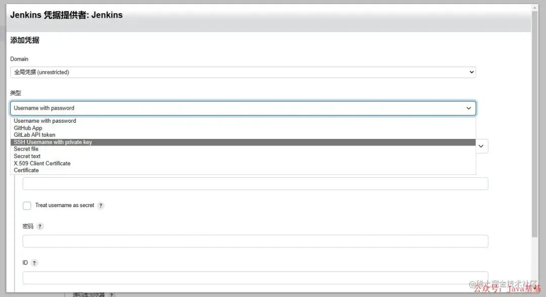 添加 Credentials 的时候,如果你会使用 SSH 密钥的话,建议还是用这个,但你得在机器上进行格外的配置,这里我就不多说了,不会的话直接用账号密码也是可以的: