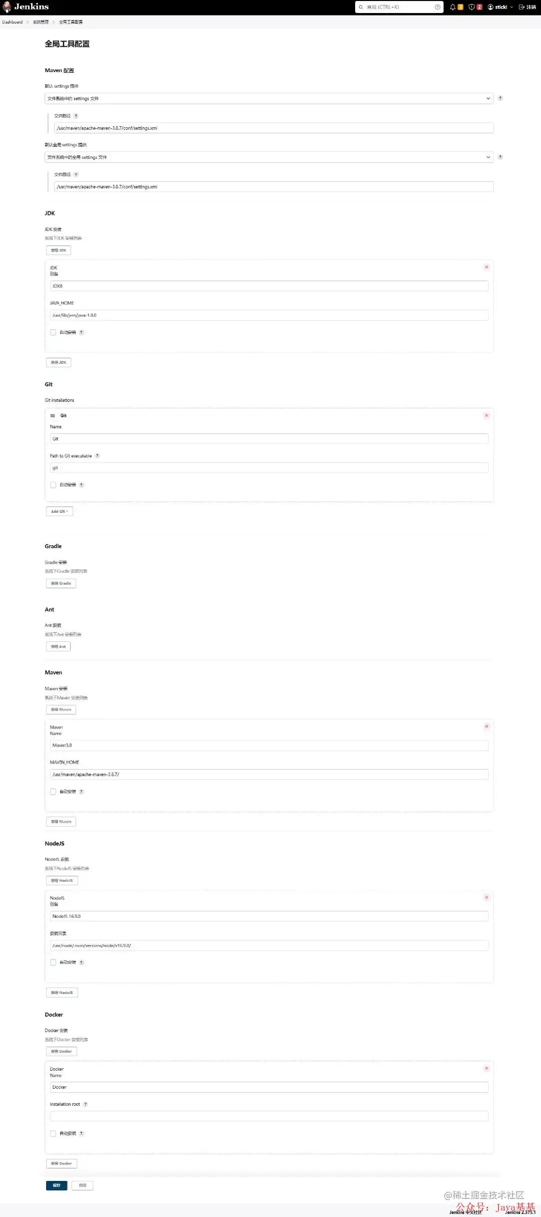 在 Jenkins 上,我已经配置好了这些构建工具的路径,以便于 Jenkins 可以直接调用到他们,在系统管理 -> 全局工具配置这个页面下,这张图有点长: