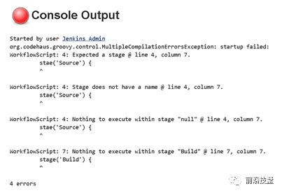 声明式流水线更加严谨的结构同样有助于错误检查。于是我们不再需要在发生错误时查看Groovy的调试信息(traceback),而是将错误信息以更加直观、简单的方式展现给用户,在大多数情况下可以直接定位到具体的错误。图1-2给出了具有增强错误检查功能的声明式流水线所输出的代码片段: