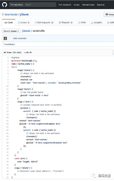 Jenkinsfile可以起到标记文件(marker file)的作用,这意味着只要Jenkins发现你的工程源码中包含了Jenkinsfile文件,那么这个项目或分支就可以被Jenkins自动解析和运行。Jenkins同样可以识别出需要用到的源码版本控制管理(SCM)项目和分支,并加载和执行Jenkinsfile中的代码。如果你熟悉Gradle构建工具,这个理念与应用中定义的build.gradle文件类似。我会在本书中对Jenkinsfile进行更加详细的描述。