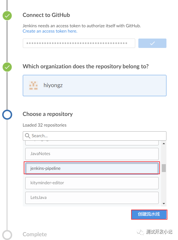 2、输入github access token,选择有jenkinsfile文件的仓库