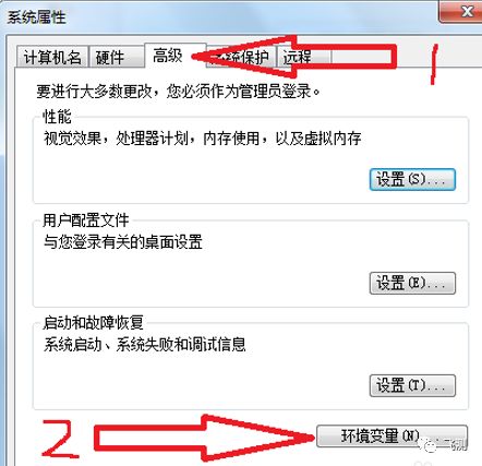 在弹出的对话框中单击高级选项卡,接着点击下方的环境变量: