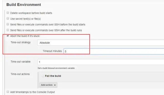 所以,我们需要设置构建超时时间来预防这种事情发生,一旦超过一定的时间,要让 Job 自动停止掉,如下: