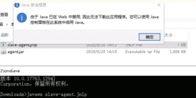 在节点机双击jnlp文件没有反应时,可以尝试用命令行方式运行此文件,cmd进入jnlp文件目录下,运行javaws slave-agent.jnlp,可以查看具体的错误提示,如下: