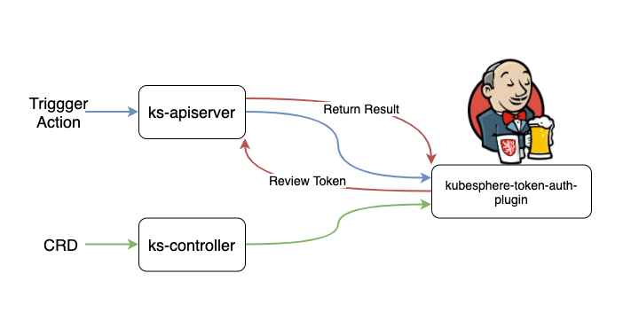 Jenkins 插件kubesphere-token-auth-plugin集成 KubeSphere 的认证体系,在 KubeSphere 调用 Jenkins 时,都需要经过 ks-apiserver 进行 token 的 review, 通过之后再调用 Jenkins 执行实际动作