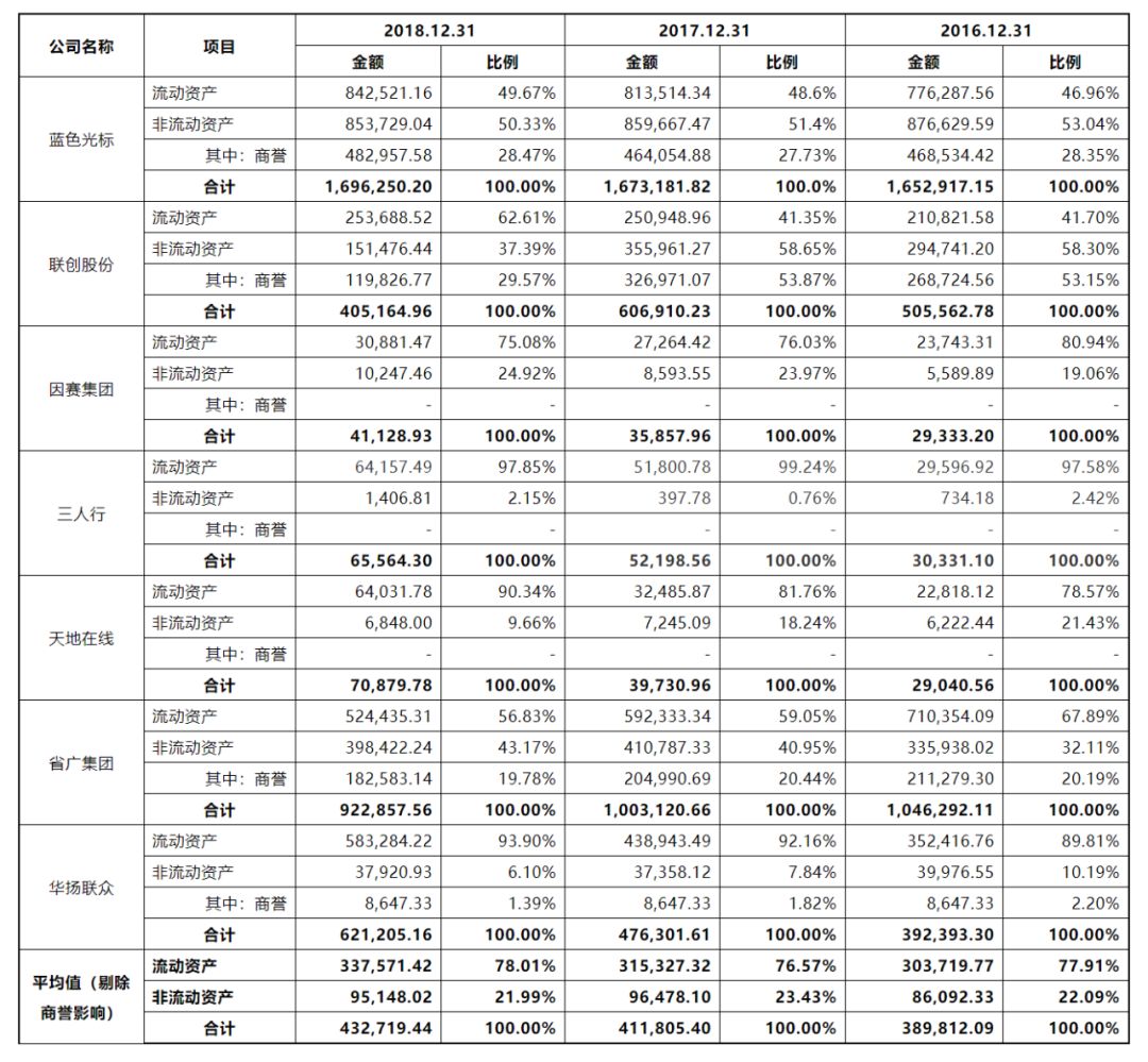 通过分析互联网营销公司的财务数据,发现互联网营销行业的一个重要特征是轻资产。剔除商誉影响后,7家互联网营销公司的流动资产平均占比达到3/4。