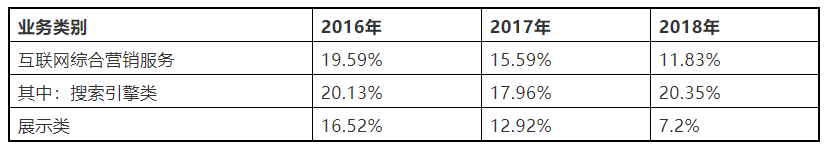 通过对各公司2016年-2018年的互联网营销业务毛利率进行纵向比较分析,由于市场竞争、客户分布变化等原因,其毛利率总体存在下降趋势。