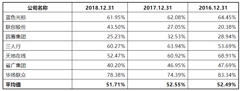 互联网营销行业还有一大重要特征是,资产负债率普遍较高。2016年-2018年,行业内公司的资产负债率平均约52%左右,资产负债率水平较高,主要系行业经营特性所致。