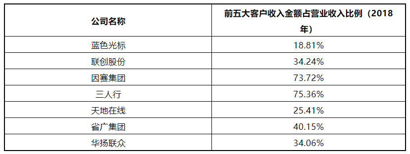 客户集中度较高是互联网营销行业的特点之一。联创股份、因赛集团、三人行、省广集团以及华扬联众的客户集中度都很高。