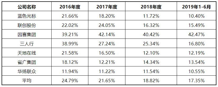 2019年被称为广告业的寒冬,反映在互联网营销公司上就是毛利率的下滑。7家公司的平均毛利率从2016年的24.79%下滑到了2019年上半年的17.35%。