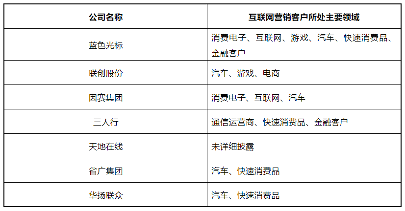 除了蓝色光标的客户涉及行业较广外,其他6家互联网营销公司的客户都集中于2-3个优势行业。这可能与各自的发展历程有关。