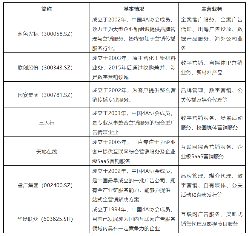 互联网营销公司行业集中度相对较低。目前国内已上市或拟上市的互联网营销公司包括蓝色光标、联创股份、因赛集团、三人行、天地在线、省广集团、华扬联众等。2018年,上述7家公司的互联网营销收入仅占当年互联网营销行业市场规模的5.53%。