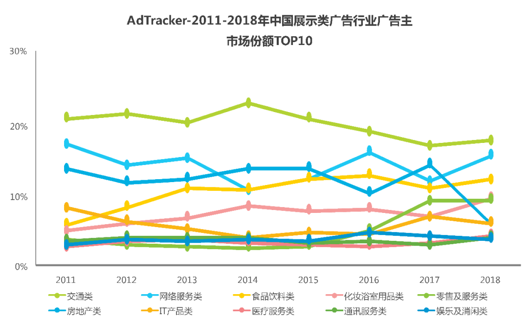 根据艾瑞咨询的数据,2011年至2018年,交通、网络服务、房地产、食品饮料、化妆浴室用品、零售及服务等行业的广告金额持续排名靠前。受到新零售业态形成、下沉渠道逐步构建等因素影响,2018年食品饮料类、化妆浴室用品类等快速消费品行业互联网营销需求增长强劲。