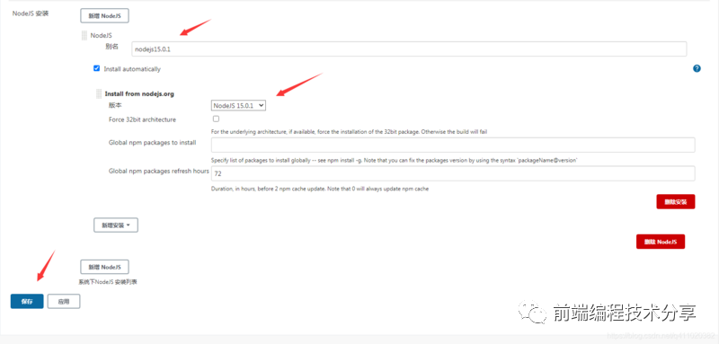 Manage Jenkins->Global Tool Configuration配置 nodejs。如果你的电脑是 win7 的话,nodejs 版本最好不要太高,选择 v12 左右的就行。