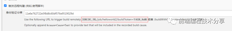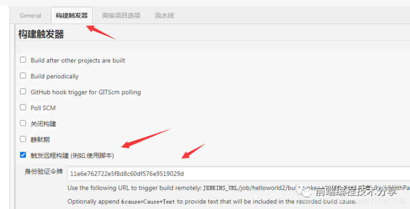 构建触发器,选择触发远程构建,填入刚才创建的 token。