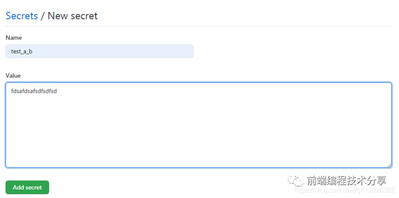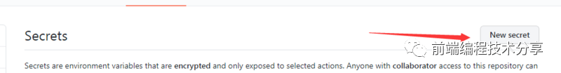 secrets->new secret。创建一个密钥,名称随便填(中间用下划线隔开),内容填入刚才创建的 token。